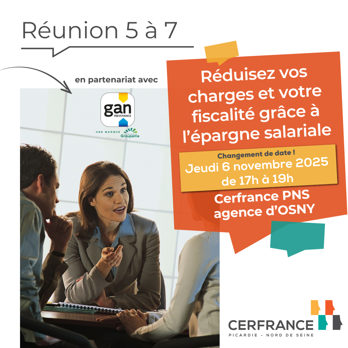 Inscription à la réunion 5 à 7 "Réduisez vos charges et votre fiscalité grâce à l'épargne salariale" |